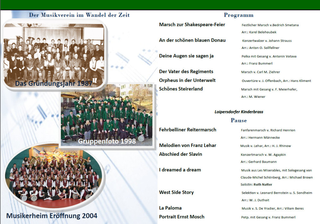 In diesem Jahr durften sich die Bewohner von Loipersdorf, den umliegenden Gemeinden und die Musiker von den anderen Vereinen auf ein besonderes Konzert freuen. Es war nicht einfach nur das alljährliche Frühlingskonzert sondern das 25-Jahr-Jubiläumskonzert! Zu hören gab es einen Querschnitt durch die vergangenen Konzertjahre mit Konzertmärschen, Ouvertüren, Filmmusik und natürlich Stücke mit Gesang, wobei es die Gesangspremiere von Ruth Natter und Alexander Kren zu hören gab. Auch 2 Jugendliche, Celina Froschauer und Stefanie Janser, hatten Ihre Premiere beim diesjährigen Konzert. Durch das Programm führte, so wie schon 24 Konzerte davor, Joschy Huber und das wieder mit viel Witz und Charme. Vor der Pause gab es noch die „Jugend-Brass-Gruppe“ – Musikschulkinder aus Loipersdorf – unter der Leitung von Mag. Martin Kerschhofer zu hören.