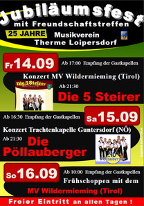 Vom 14. bis 16. September war es so weit. Nach langer Vorbereitungszeit und vielen Arbeitsstunden fand das 3 Tages Jubiläumsfest mit Rittscheintal- und Freundschaftstreffen des MV Therme Loipersdorf beim Musikerheim in Dietersdorf statt.